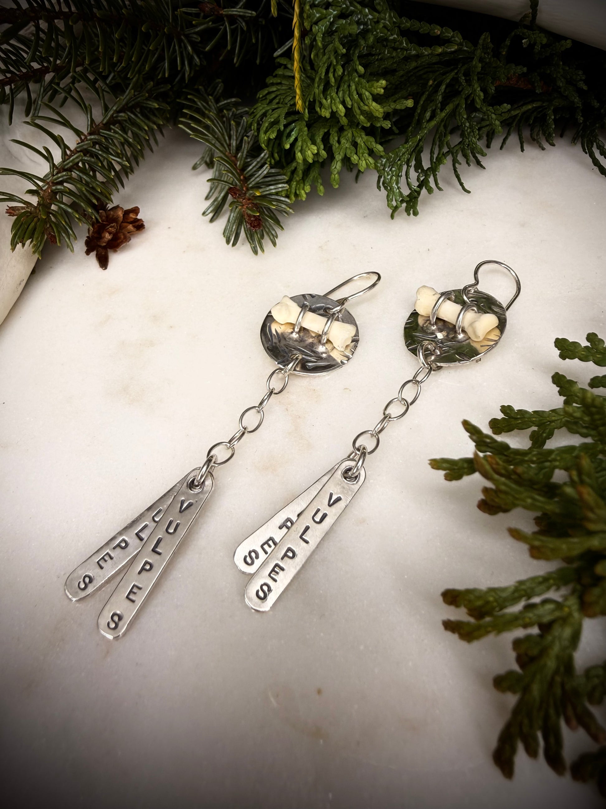 Celebrate your wild side with these captivating earrings featuring authentic red fox toe bones (phalanges) mounted on beautifully stamped silver discs. Each pair includes delicate dangling tags engraved with "Vulpes vulpes," the scientific name for the red fox. At 2.25" long from the ear wire and 5/8" wide, these pieces strike the perfect balance between statement-making and wearable. Crafted with care for those who appreciate nature's intricate details and unconventional beauty, they're a tribute to the creatures we admire.